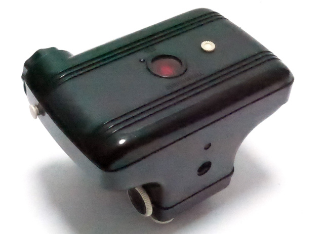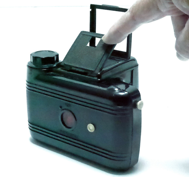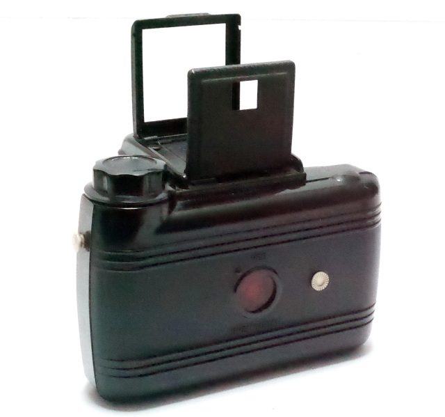 さて、パーフェクタは黒のベークライト製で、操作部、赤い窓、ストラップ取り付けノブには白いハイライトが施されています。ボディの周囲には水平のリブが入った曲線的なデザインが特徴です。このカメラは、1930年代にアメリカで生まれたストリームライン・モダン様式が1950年代まで生き残ったことを示す好例です・・とあります。