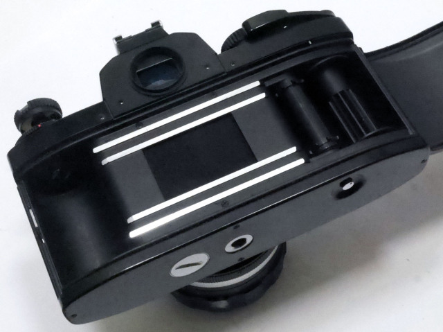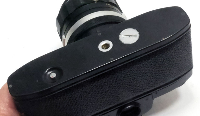 RE-Ⅱはそれを発展させ、開放測光とホットシューを装備しています。またマウント下部横に電源スイッチがつきました。白がオフ、赤がオンです。ただし巻き上げをしないとスイッチを入れても針は作動しません。受光部はミラーの背面に組み込まれ、プリズムは今までの物も使えます 開放測光としたたために絞り込みボタンが不要になり省略しています。